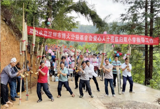 4月21日至22日,深圳市博大公益基金會理事長、集團(tuán)董事長張炳來前往貴州省黎平縣實(shí)地考察擬捐建學(xué)校場地,并回訪2021年交付當(dāng)?shù)卣褂玫膭?wù)孖小學(xué)。當(dāng)?shù)厝罕娸d歌載舞,熱烈歡迎理事長張炳來的到來。